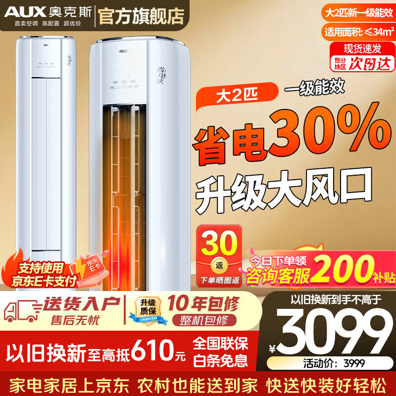 奥克斯(AUX)空调柜机大3匹/2匹立式家电补贴20% 新1级变频冷暖客厅圆柱 变频冷暖节能 升级大风口 自清洁 大2匹 一级能效省电侠(省电30%)