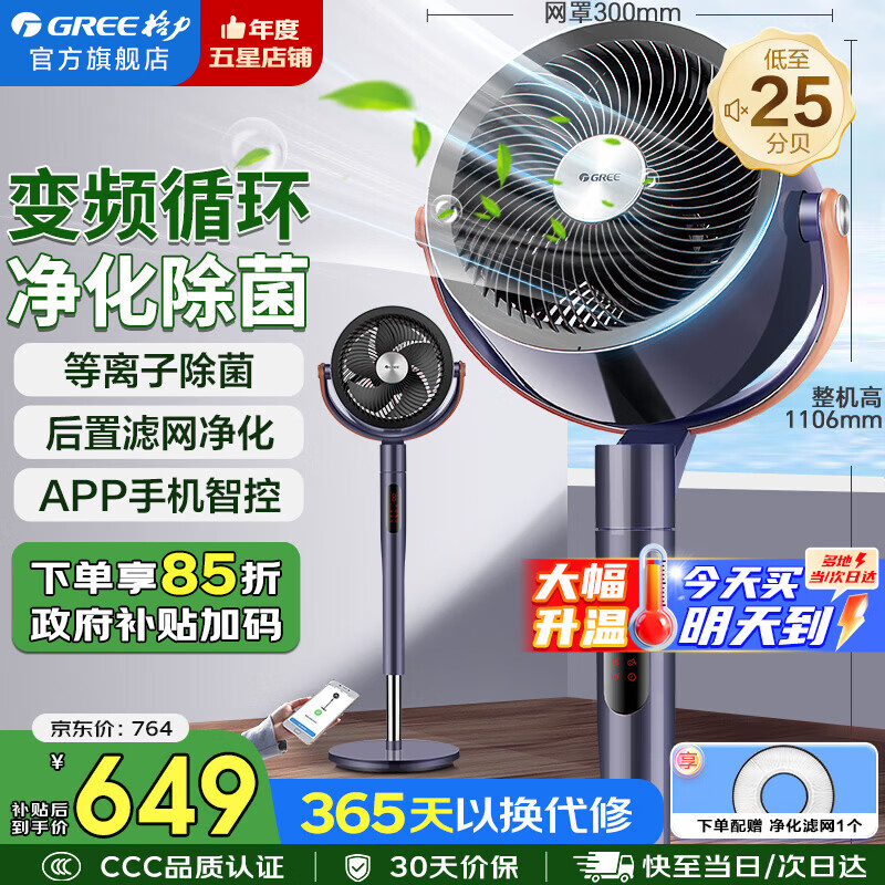格力(GREE)电风扇家用空气循环扇智能遥控落地扇等离子除菌净化扇直流变频节能电扇轻音低噪换气扇空调伴侣 FXDZ-2305Bg5-等离子除菌-紫色