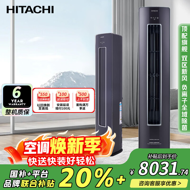日立(HITACHI)双驱新风系统新1级能效3匹立柜式全直流变频柜机立式新风空调负离子除菌自动除湿国家补贴以旧换新 白熊君ZH 双驱新风 3匹 适用面积28-48平