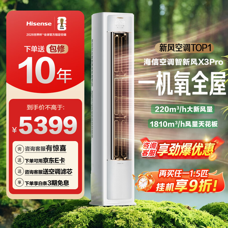海信(Hisense)智新风X3Pro 大3匹 220m³/h新风量 AI省电 新风5重净化 大客厅柜机新风空调 KFR-72LW/X300Pro-X1 限时补贴15%