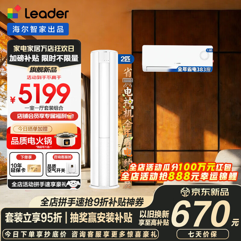 海尔空调套装智家出品统帅立式柜三室一厅节能变频新一级能效冷暖家用三室二厅自清洁 超省电挂机+柜机 【一室一厅 全一级能效】2匹柜机+1.5匹挂机