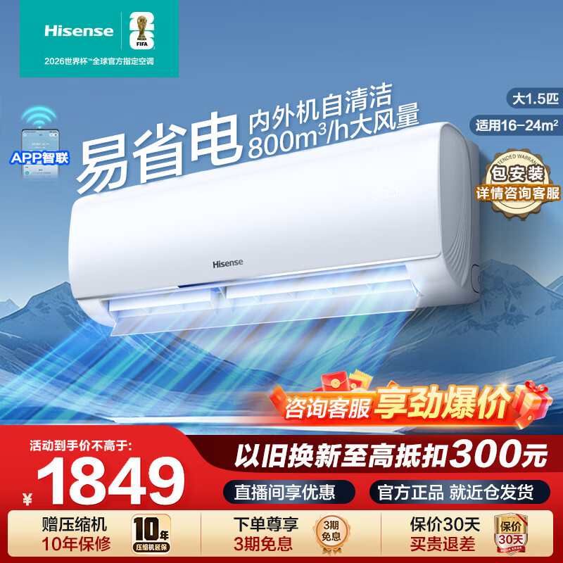 海信(Hisense)大1.5匹空调挂机【咨询客服享大额优惠】 易省电 AI省电 速冷热 大风量 新一级能效 卧室壁挂式 大1.5匹一级能效【800m³/h大风量】E290 享压缩机十年包修权益