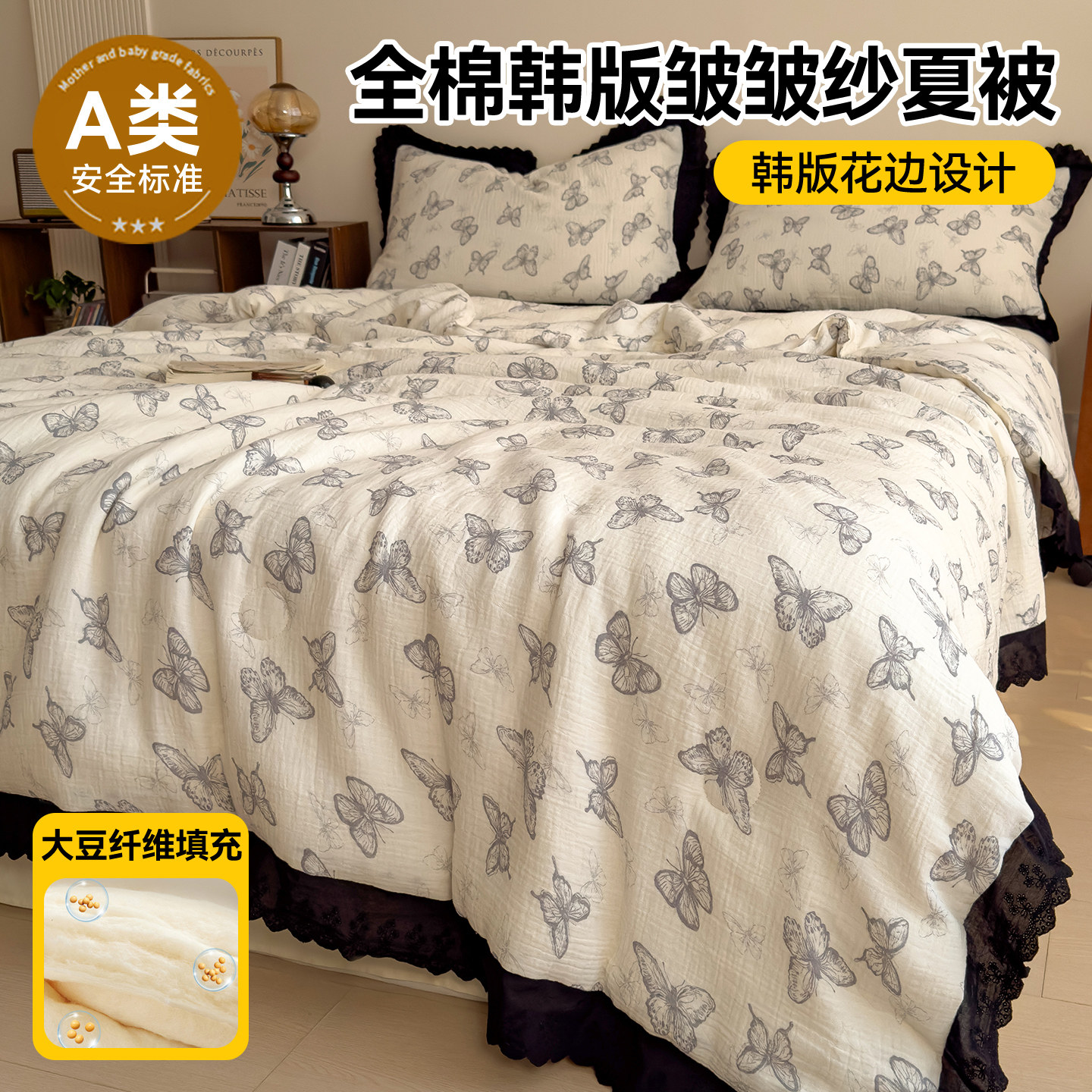 A类全棉皱皱纱大豆夏被纯棉夏季空调被单双人可机洗夏凉被三件套