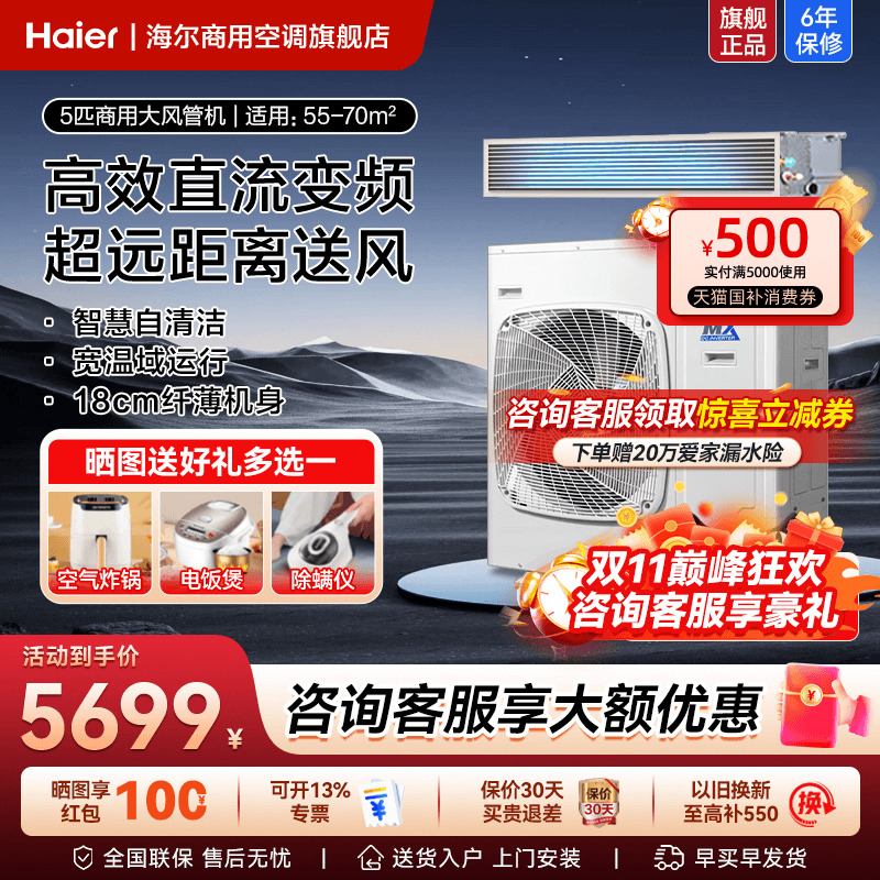 海尔大6匹5匹风管机一拖一中央空调冷暖变频超薄嵌入式商用旗舰店