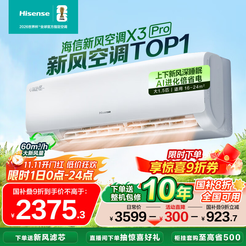 海信(Hisense)新风空调 X3Pro 大1.5匹 增氧新风 AI省电 新一级能效国家补贴20% 深睡眠挂机KFR-35GW/X300Pro-X1