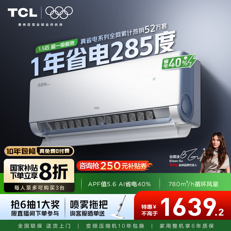 TCL空调大1.5/2匹 小蓝翼真省电Pro空调挂机超一级能效省电40%家用大风量卧室冷暖变频以旧换新 大1.5匹 一级能效 真省电Pro系列