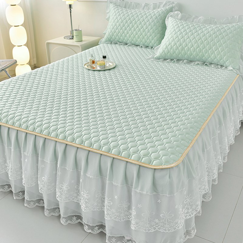 夏季床裙款凉感丝冰豆豆凉席三件B套公主风蕾丝机洗空调软席子少