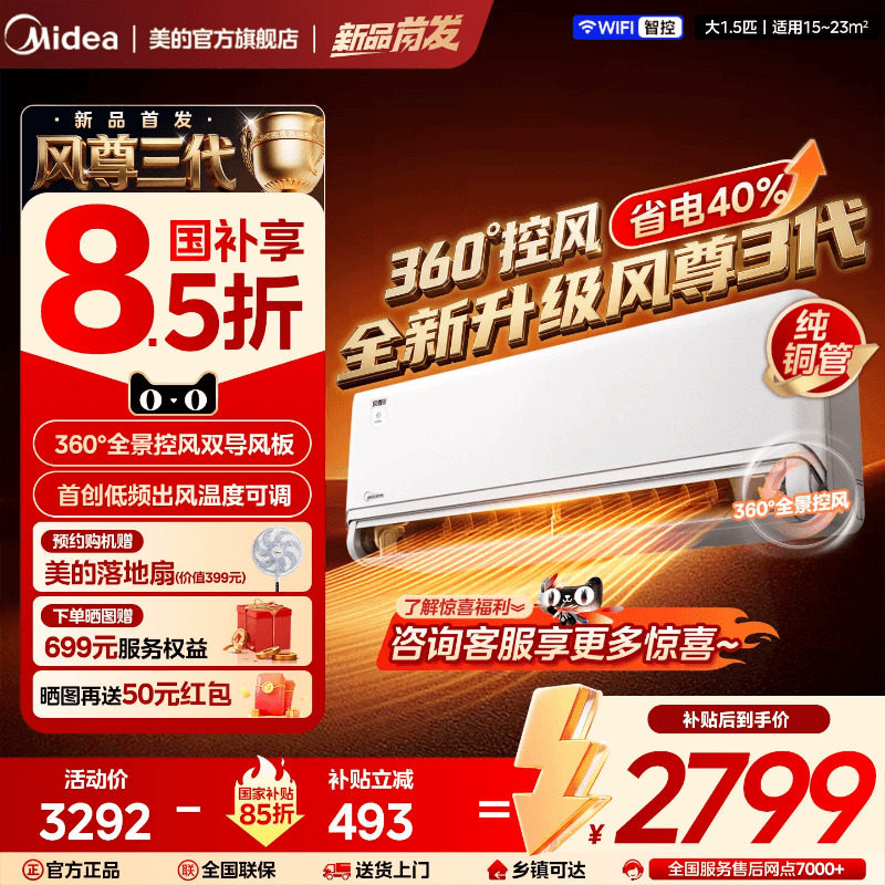 美的空调大1.5匹1匹新一级能效变频冷暖官方家用挂机风尊二代Pro