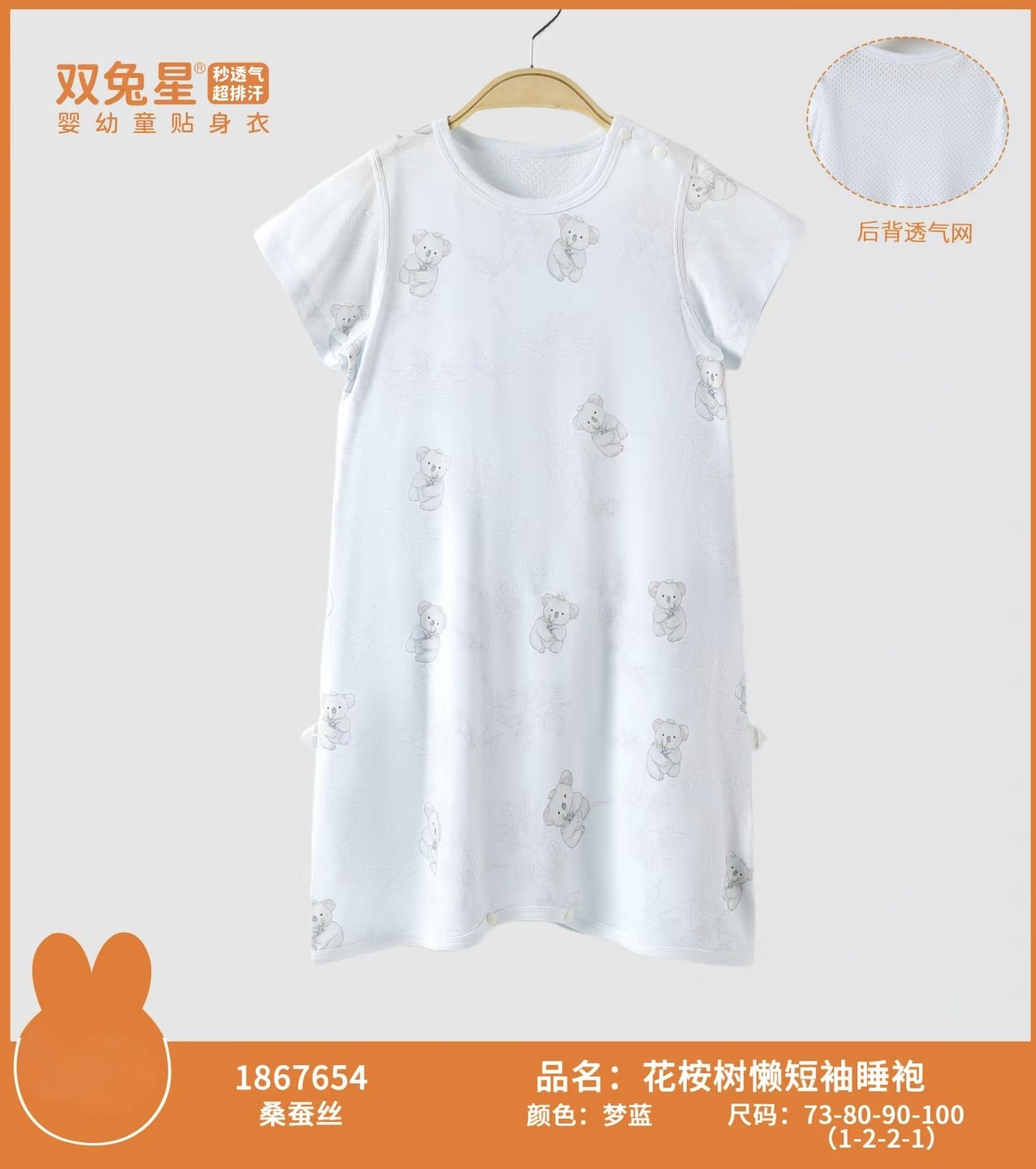 双兔星夏婴儿桑蚕丝空调服男女宝宝超薄家居服短袖睡袍后背透气网