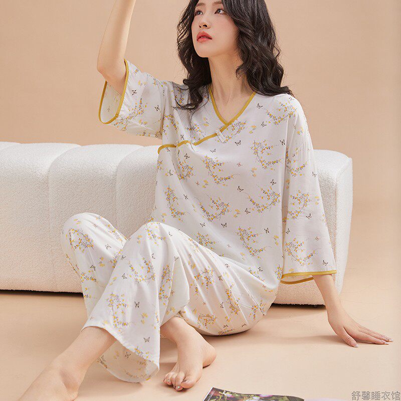 绵绸睡衣女夏季薄款新中式女装空调服时尚国风纯棉棉绸家居服套装