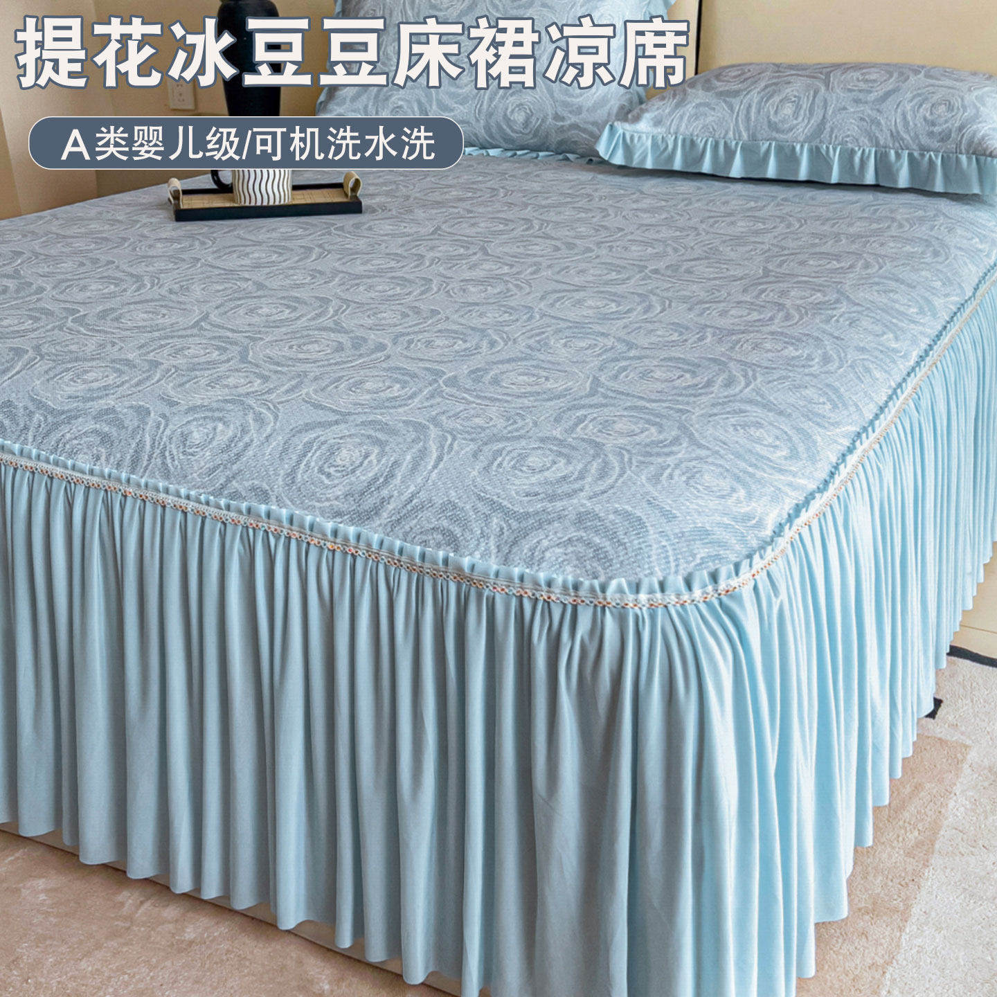 ins小清新提花冰丝凉席三件套床裙款夏天冰豆豆空调席软席子床罩3