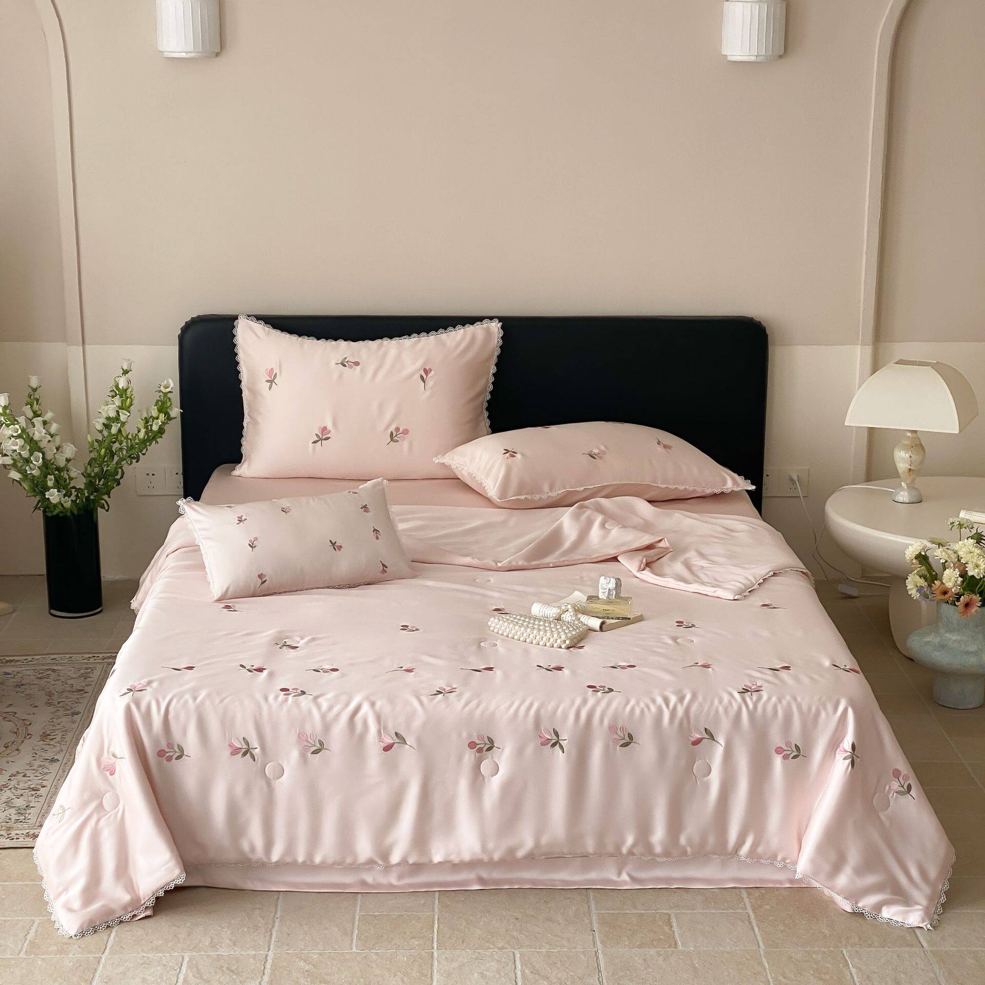 春夏季60s天丝夏凉被小清新少女心花卉刺绣双人空调薄被凉感被