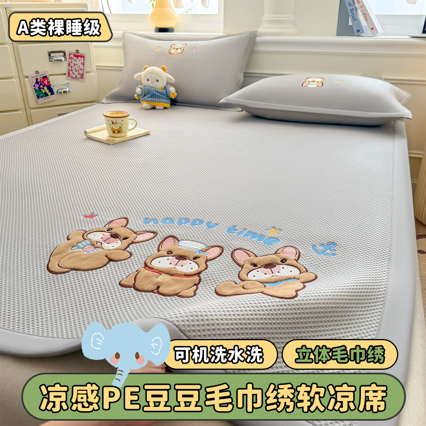 ins卡通冰丝凉席三件套夏季凉感冰豆豆空调席可机洗学生宿舍软席