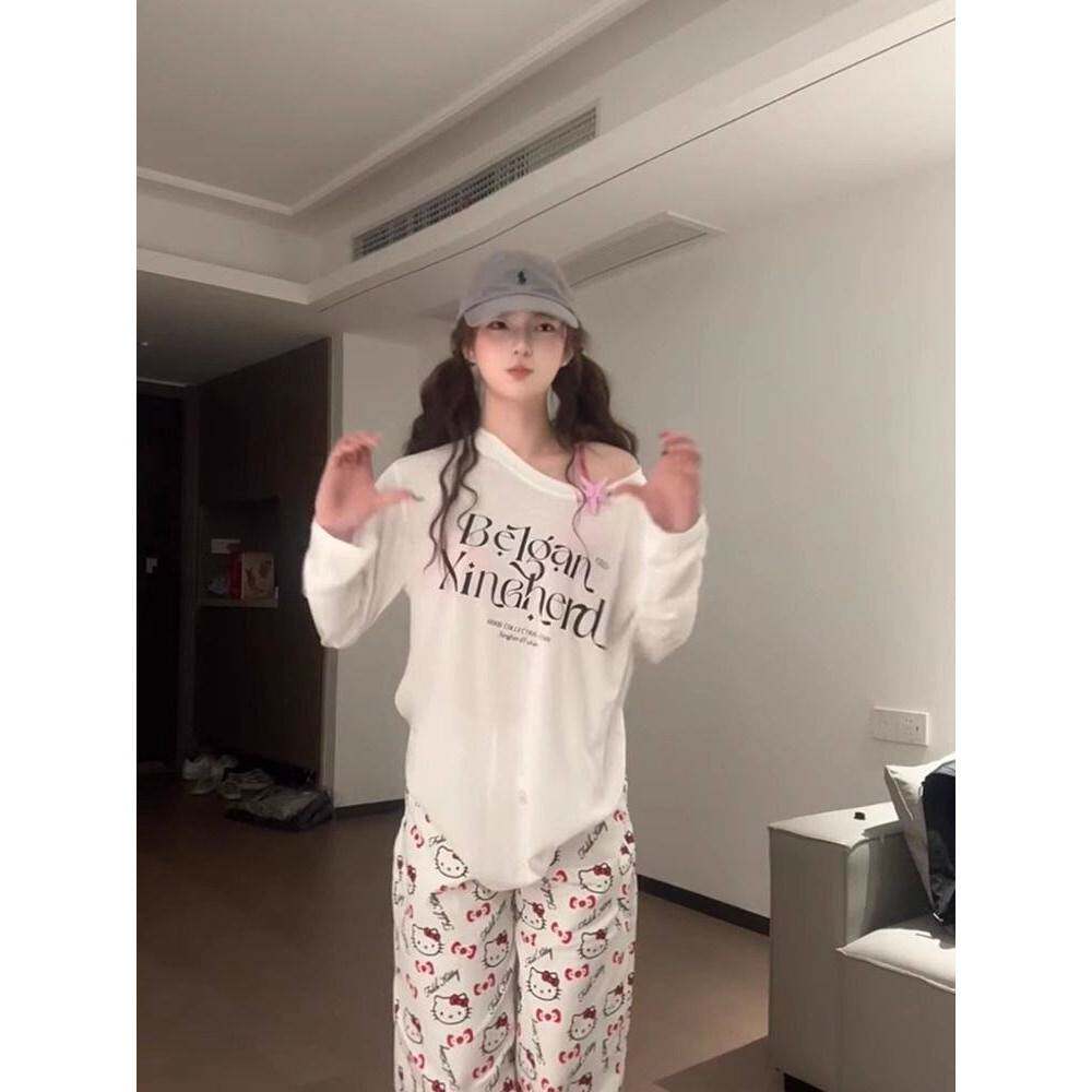 韩系白色防晒罩衫字母印花长袖T恤女夏季新款宽松休闲空调衫上衣