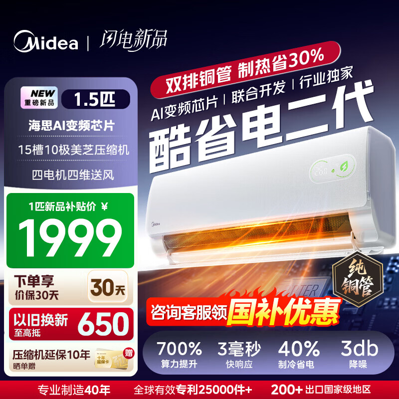 美的空调挂机 1.5匹酷省电二代 大1匹酷省电Pro 国家补贴15% 一级能效变频冷暖智能 以旧换新旗舰店 酷省电二代Pro 1.5匹 【双排铜管】
