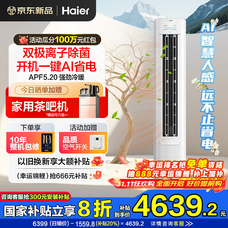 海尔(Haier)空调柜机3匹新一级能效以旧换新国家补贴20%变频家用省电客厅立柜式冷暖空调KFR-72LW/81@U1-Ht