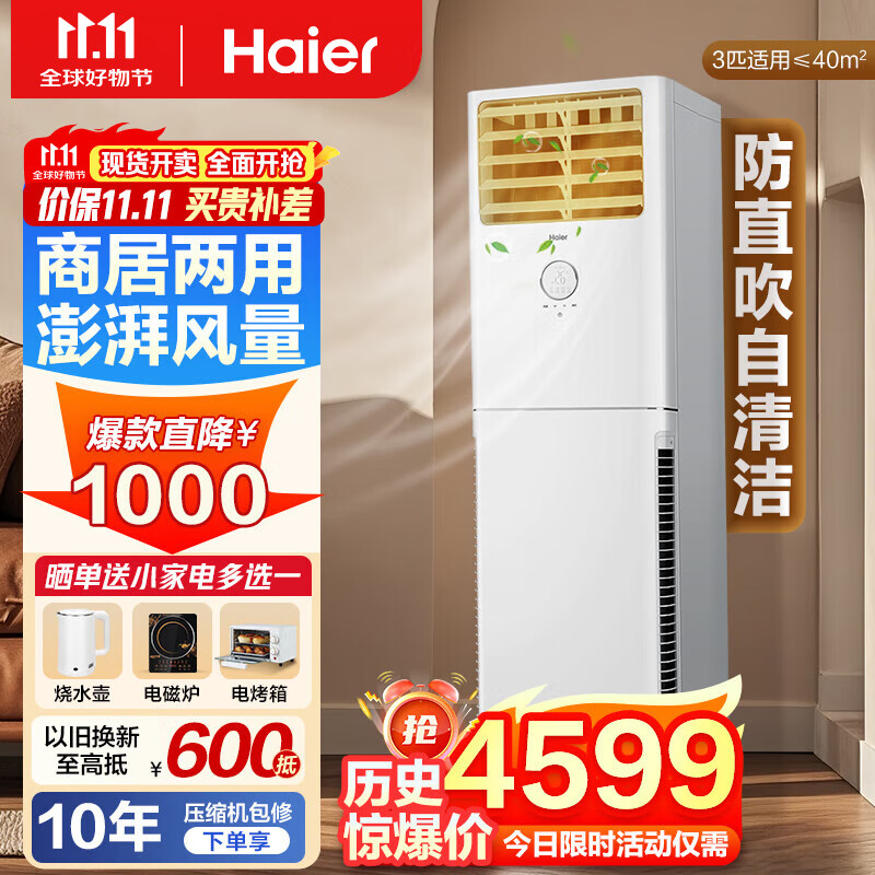 海尔空调净省电Plus 3匹强劲冷暖新一级能效节能变频家用立式柜机独立除湿以旧换新升级大风口离子除菌 3匹 一级能效 净省电神机+离子除菌+省电大魔王