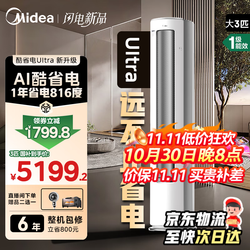 美的(Midea)空调 酷省电Ultra 3匹柜机 新一级能效 AI酷省电技术 变频冷暖立式 智能家电以旧换新 3匹 一级能效 KFR-72LW/N8KS1-1U