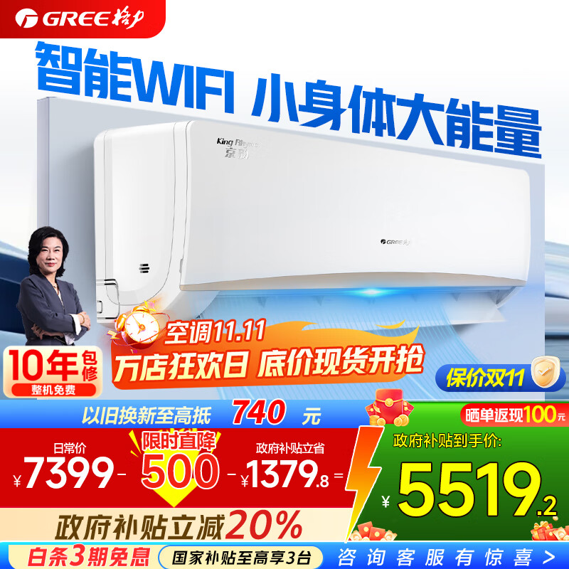 格力(GREE)空调京韵 新一级/三级能效变频冷暖 大风量 高温自洁 WIFI小客厅大卧室壁挂式大挂机 家电补贴 3匹 一级能效 京韵
