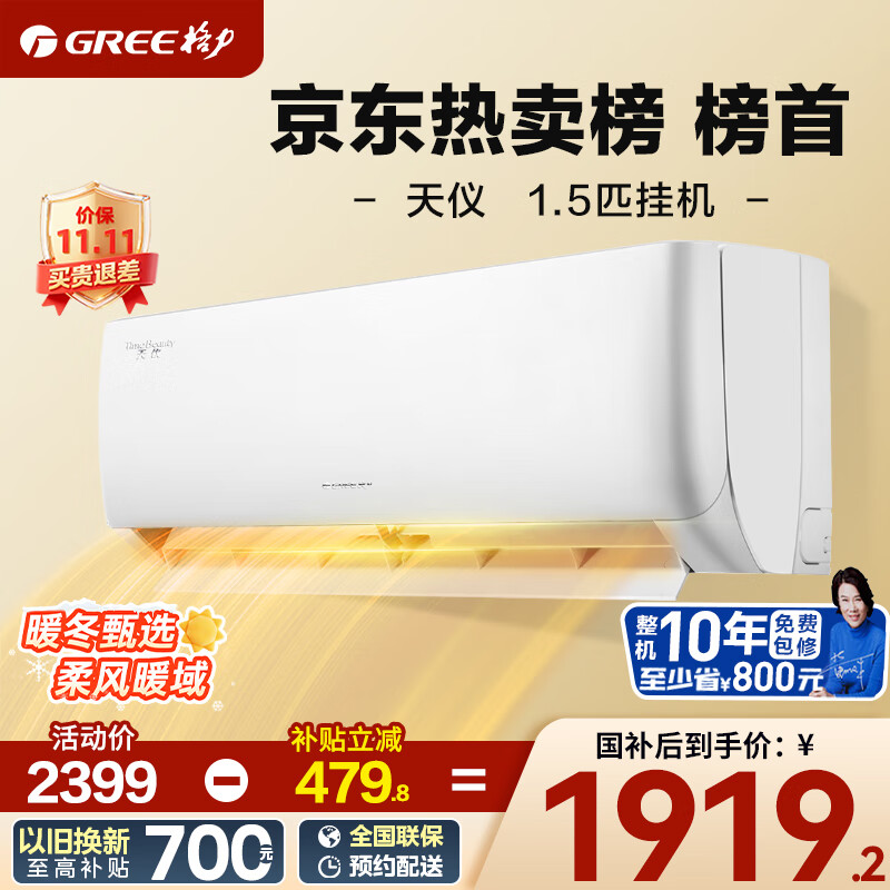 格力空调 天仪 新一级能效 变频冷暖 自清洁 壁挂式卧室挂机 家电国家补贴20% 政府补贴 1.5匹 一级能效 适用【15-20㎡】