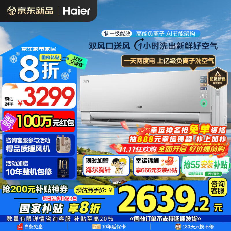 海尔空调洗空气Pro 1.5匹新一级变频冷暖卧室壁挂式声源定位送风 聚合双向风智慧除湿 高能负离子除醛 1.5匹 一级能效 洗空气+净化空气+除空气污染物