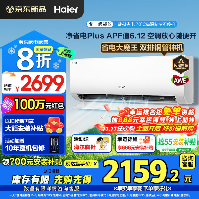 海尔空调净省电Plus1.5匹强劲冷暖新一级能效节能变频家用挂机壁挂式一键AI省电除菌 全屋智联独立除湿 1.5匹 一级能效 省电大魔王+大风口一键AI省电