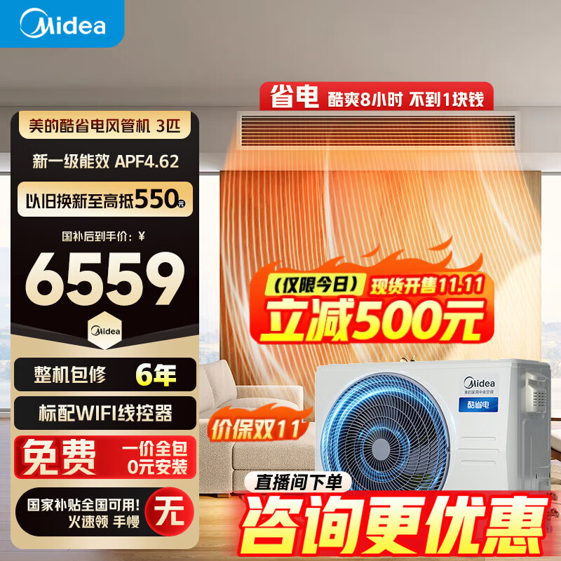 美的中央空调酷省电85嵌入式风管机一拖一大3匹4匹一级能效4代全屋智联 一价全包【国家补贴20%】 大3匹 一级能效 酷省电(32-48㎡)