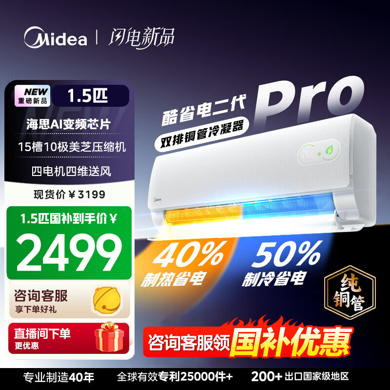 美的(Midea)空调挂机大1.5匹 酷省电二代Pro 双排铜管一级能效变频冷暖家用空调 官方直营 以旧换新 国家补贴 酷省电二代 Pro一级能效 大1.5匹 【海思芯片】