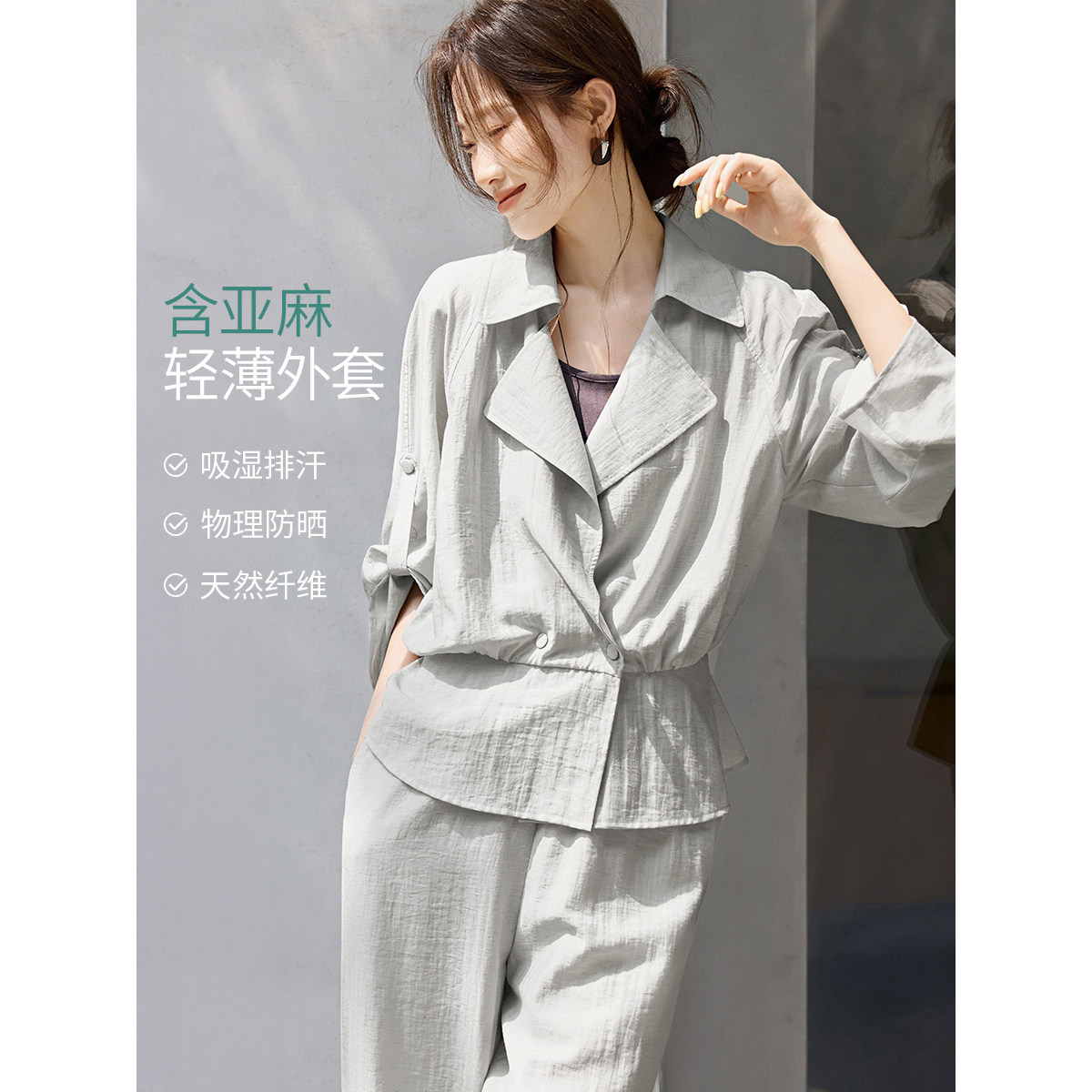 沫晗依美含亚麻轻薄空调衫2026春季轻量百搭廓形荷叶边收腰女外套