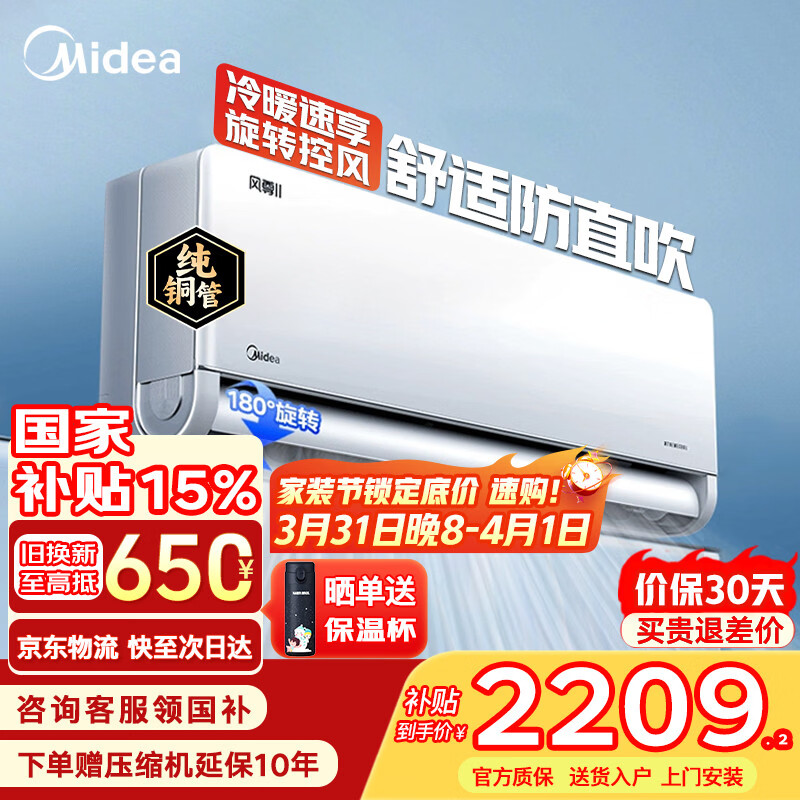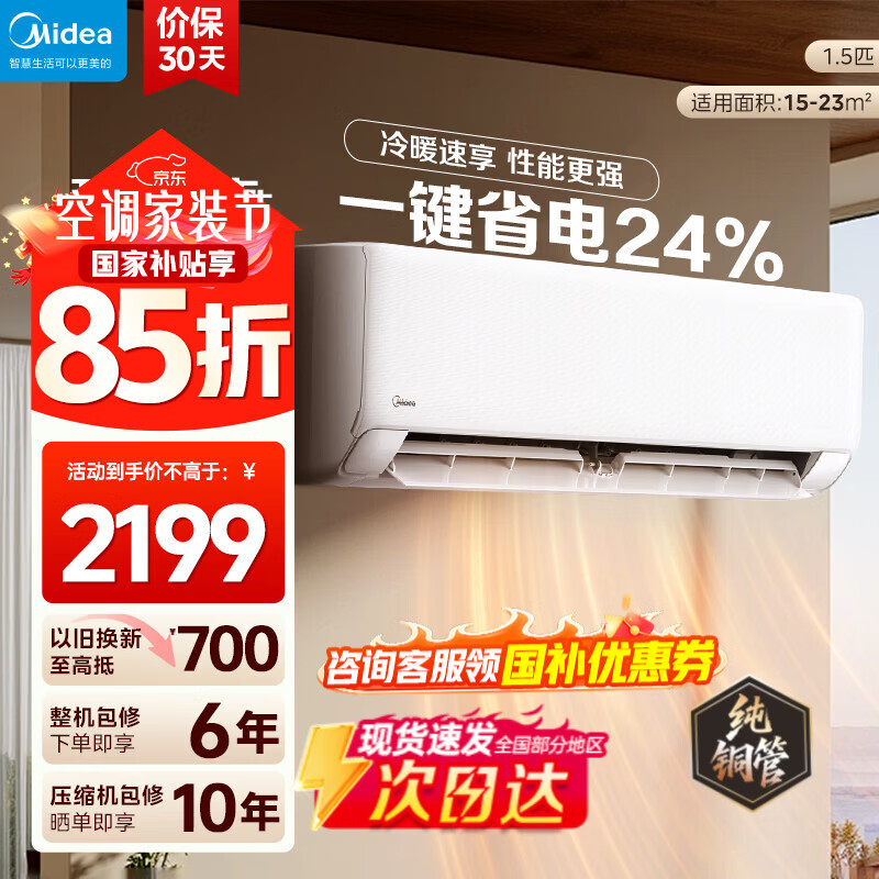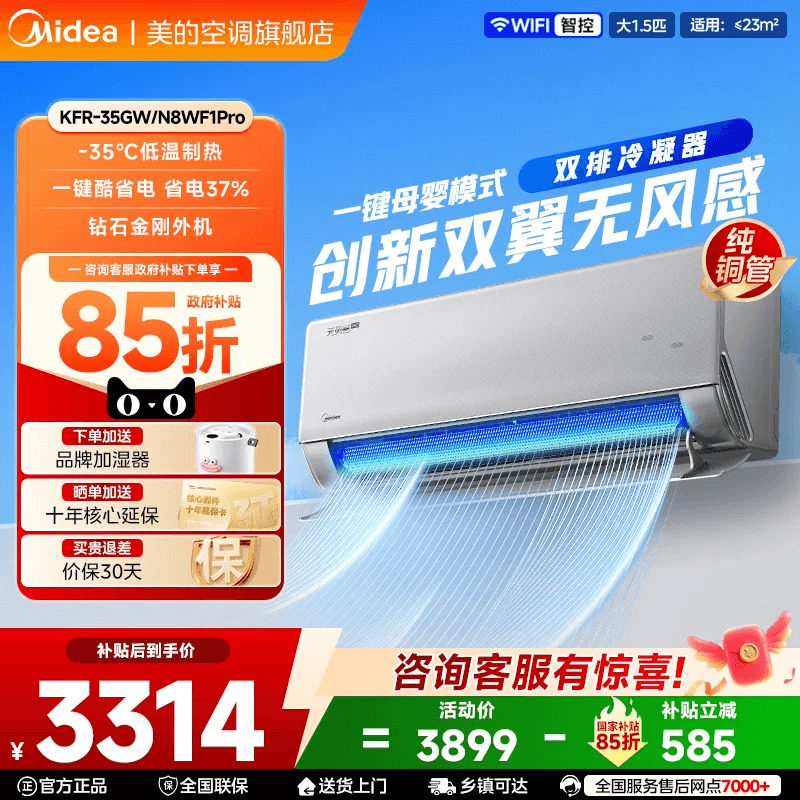 美的(Midea)空调挂机风尊二代Pro大1.5匹 新一级能效 变频节能冷暖两用壁挂式卧室空调防直吹APP智控 以旧换新 风尊二代 大1匹 舒适防直吹 180°控风