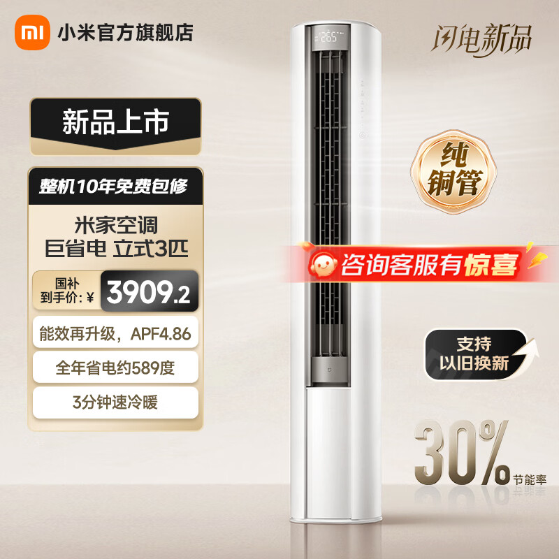 小米立式空调 巨省电 新一级变频冷暖客厅温湿双控智能柜机节能空调大广角超远距送风 国家补贴 巨省电 2026款 大3匹 1755m³/h大风量