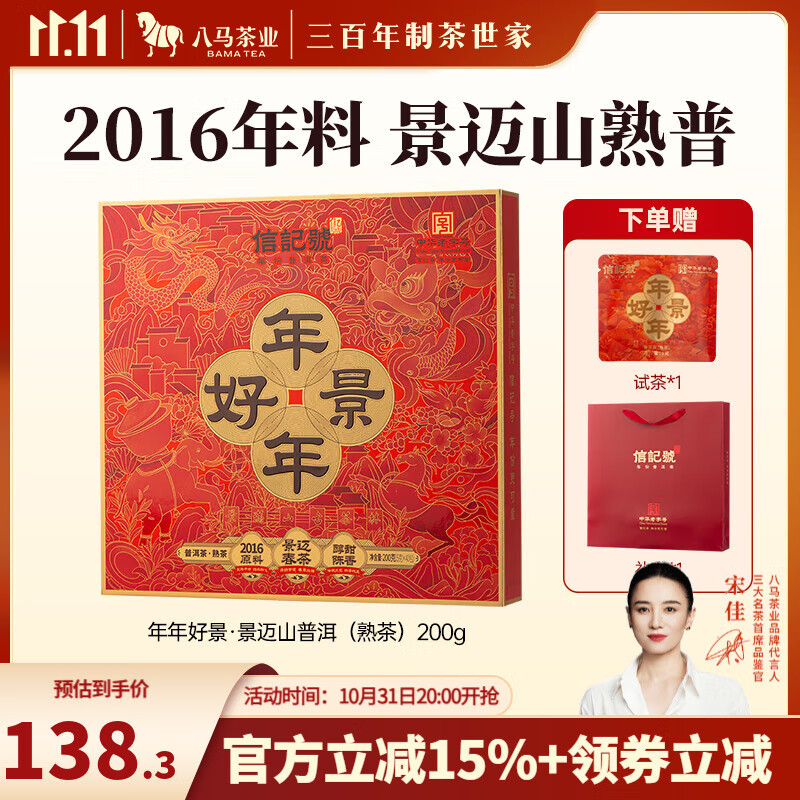 八马茶业 信记号 中华老字号 云南景迈山普洱熟茶 熟普 小圆饼 送礼茶叶 2016年茶料【年年好景】200g