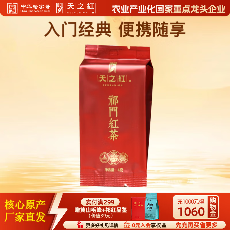 天之红茶叶中华老字号祁红 祁门红茶正宗原产地自己喝的一级口粮茶 一袋一泡4g试饮装