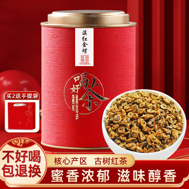 吴家世茶滇红金螺 特级茶叶滇红茶蜜香型嫩芽云南凤庆古树红茶 100克罐装