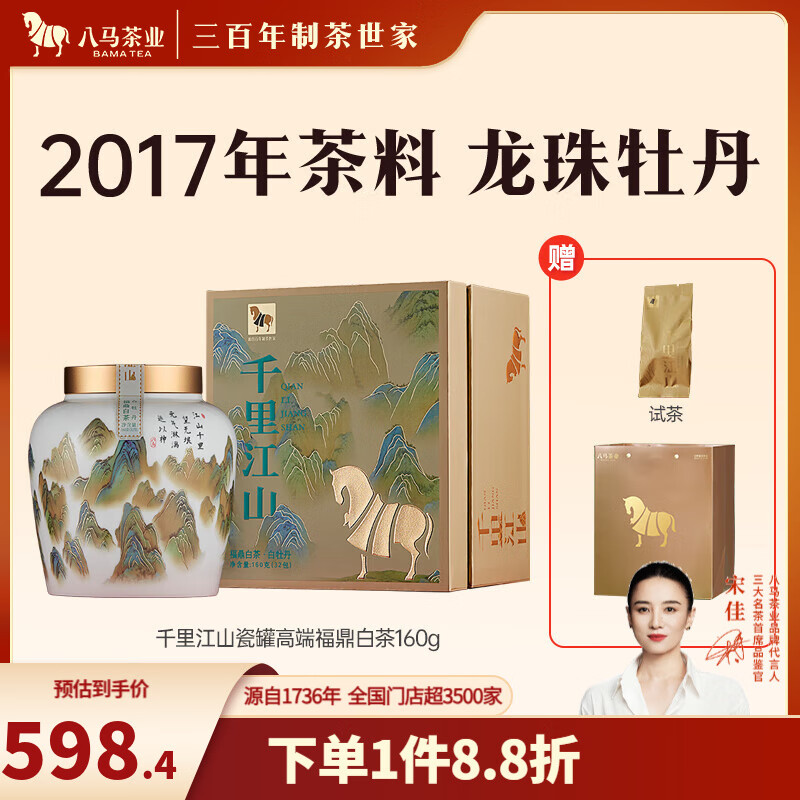 八马茶业 福鼎白茶 白牡丹 2017年原料 送礼茶叶 千里江山 陶瓷罐礼盒装 160g【赠试茶+礼袋】