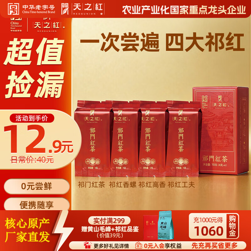 天之红茶叶祁门红茶自己喝的口粮茶一级 四大祁红组合装4g*4袋共16g