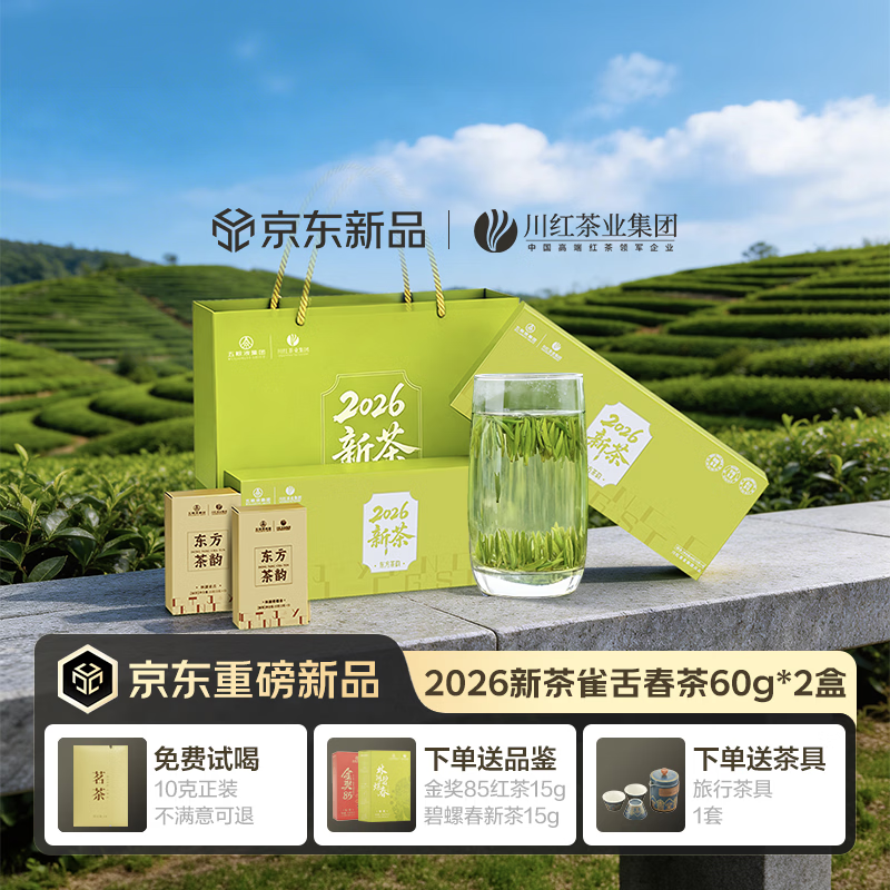 川红 2026新茶现货 特级绿茶雀舌春茶 宜宾头采高山早茶 茶叶礼盒 送手提袋 60g*2盒