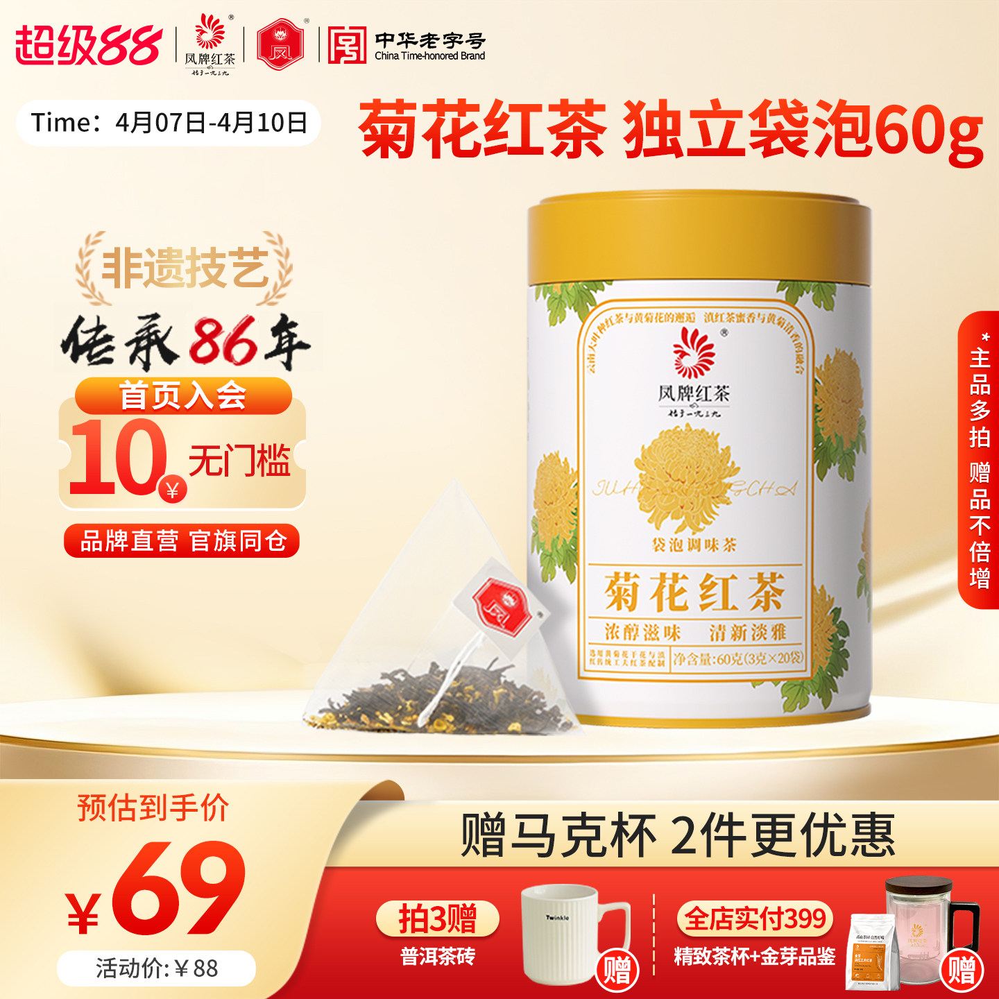 【新品】凤牌滇红菊花红茶独立袋泡茶包冷泡清甜浓香云南茶叶60g