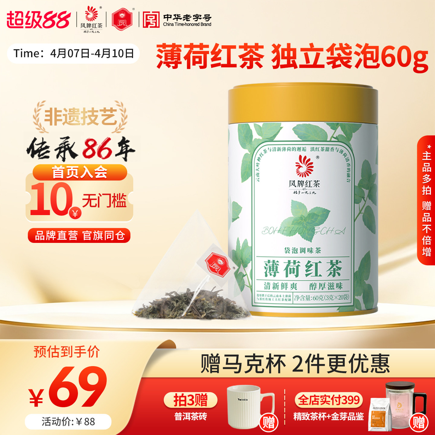 【新品】凤牌滇红薄荷红茶调味茶包袋泡茶清新浓香型云南茶叶60g