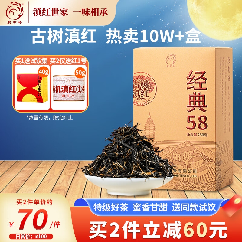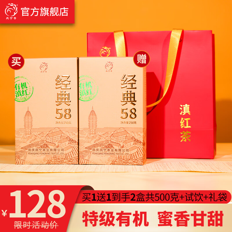 凤宁号红茶经典58特级有机滇红茶云南凤庆有机红茶蜜香口粮新茶叶自己喝 【买1送1】盒装250g