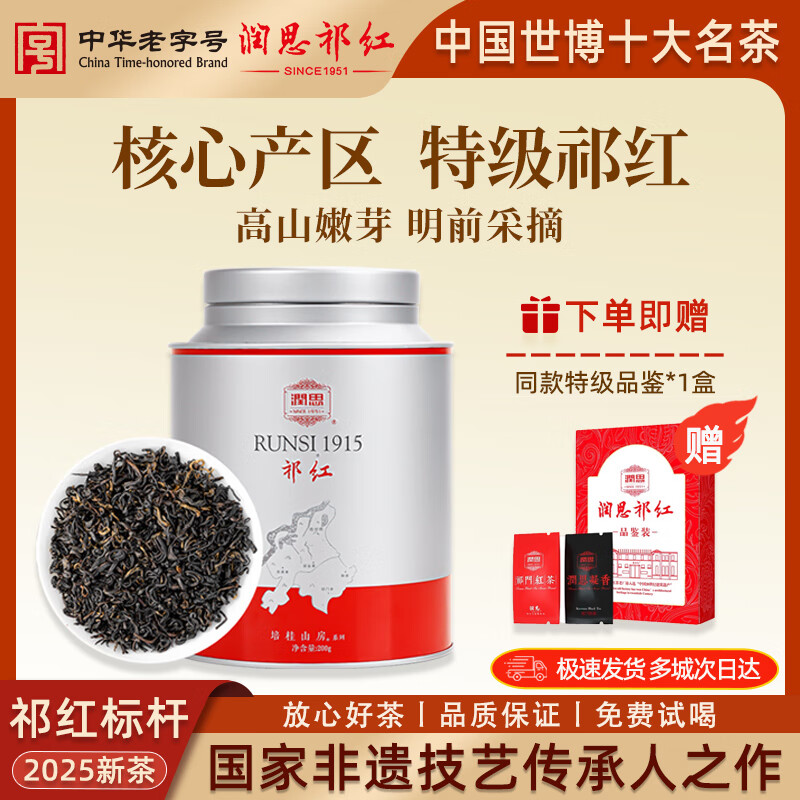 润思祁门红茶特级红茶茶叶2025新茶口粮茶自己喝送长辈父母家长礼品 祁红香螺200g 1915系列(特级一等)