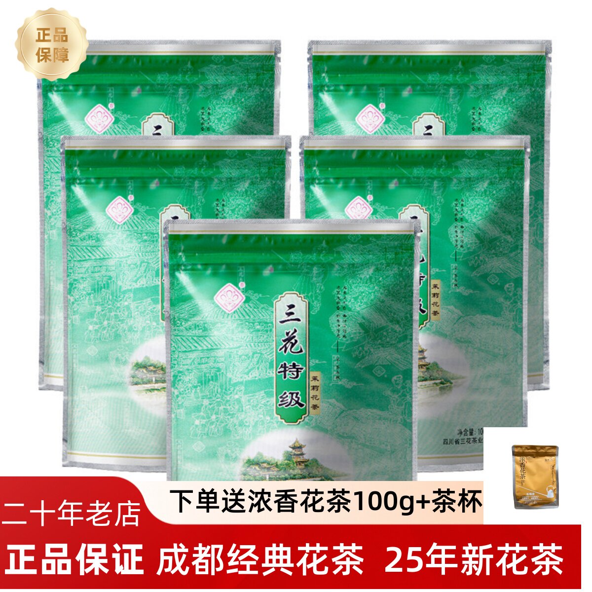 老成都三花牌特级花茶特级100克X5袋 四川老成都特产散装茶叶新茶