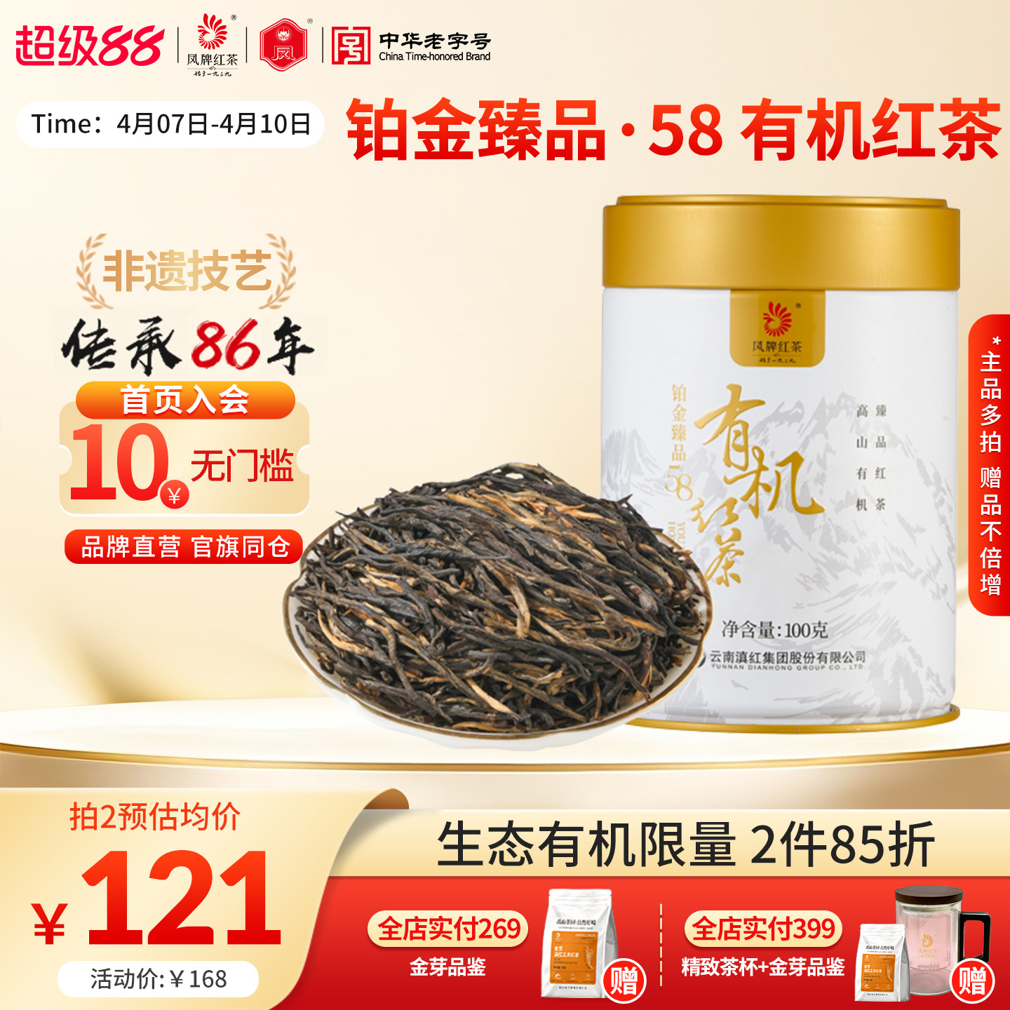 【新品】凤牌经典58升级有机红茶正宗云南滇红特级浓香茶叶100g
