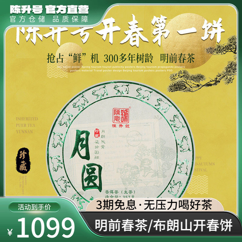 【头春茶】2019年陈升号普洱茶月圆357g云南勐海普洱生茶饼茶茶叶