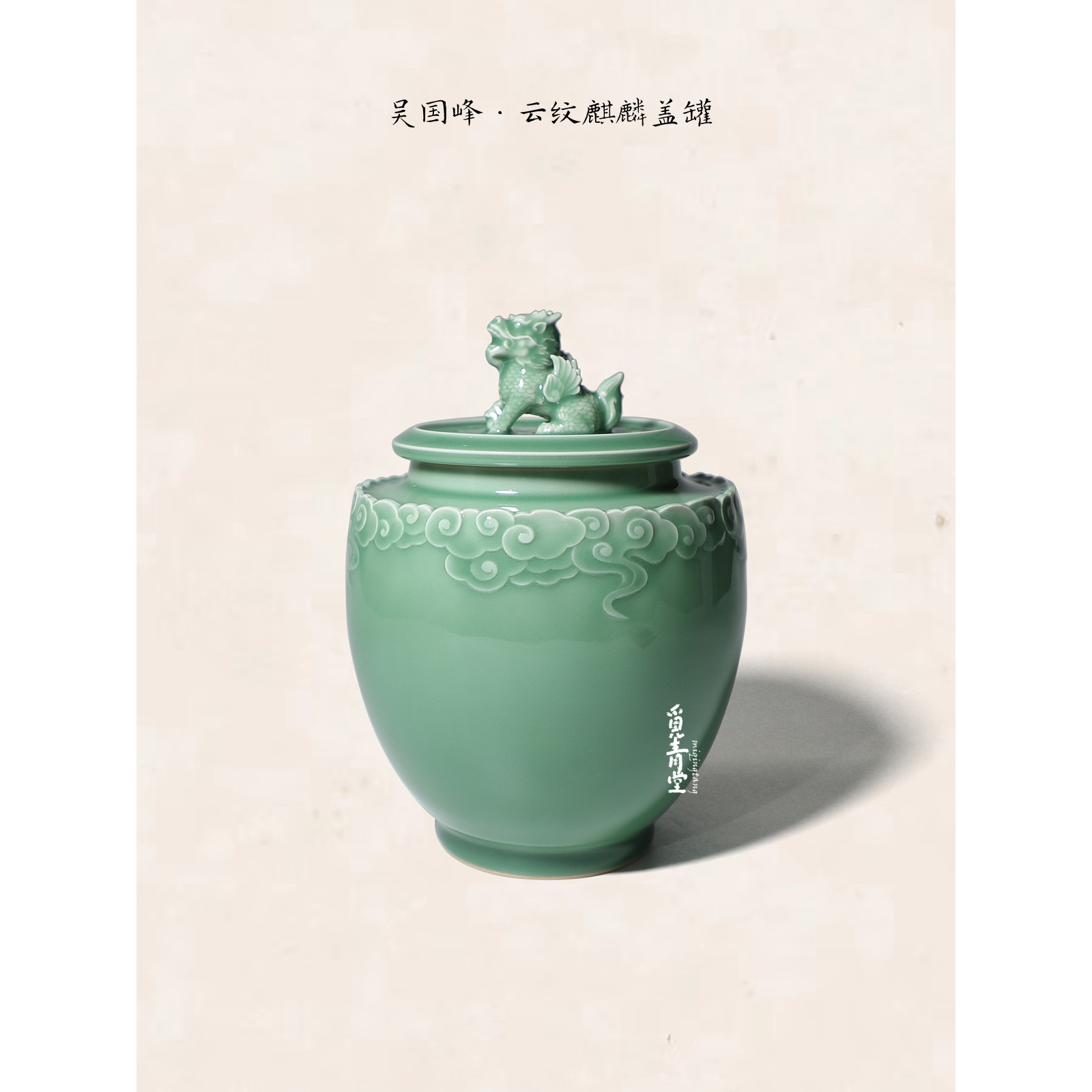觅青堂吴国峰纯手工青瓷茶叶罐云纹麒麟雕刻密封罐中式茶具储存罐