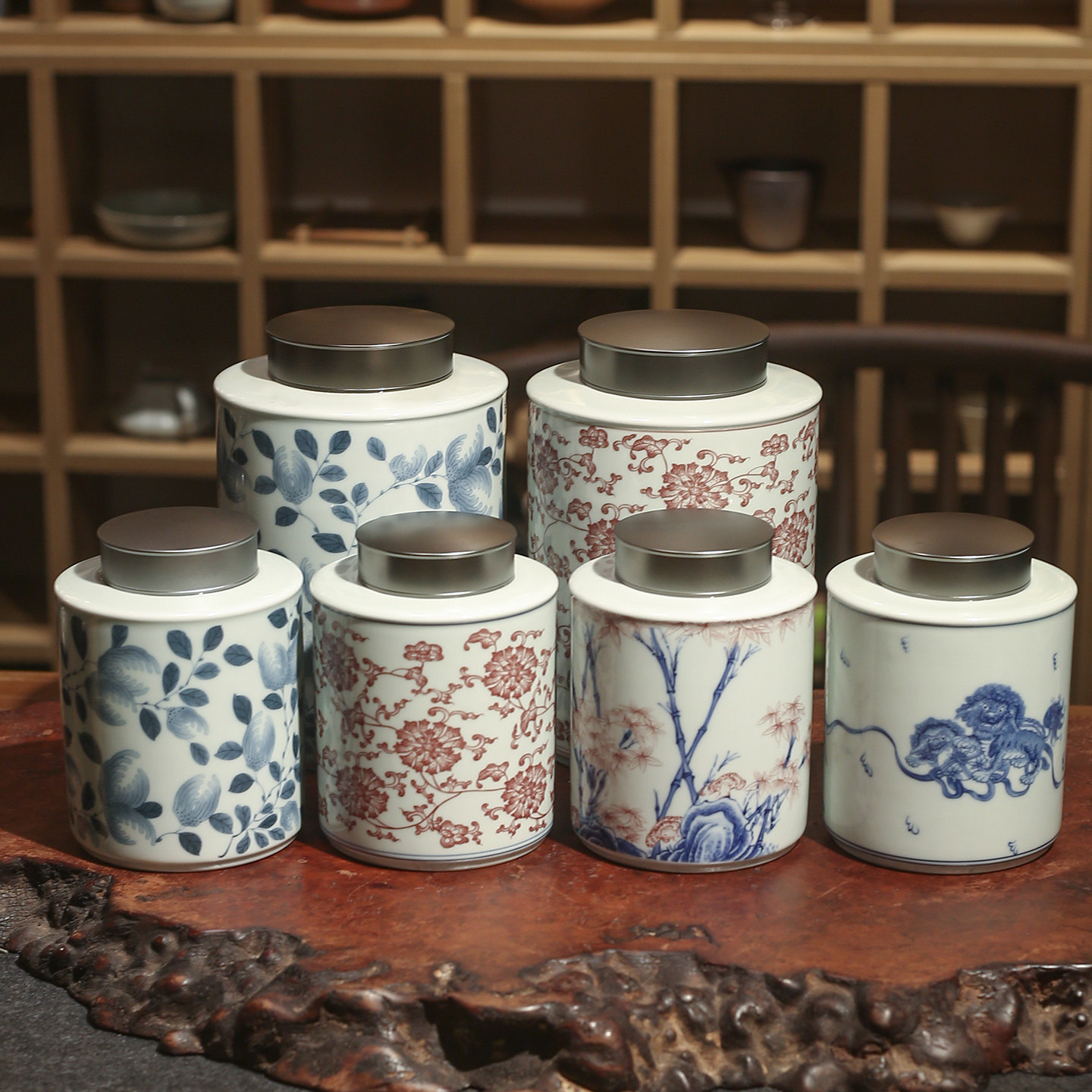 一九茶舍仿古青釉青花佛手茶仓大号釉里红缠枝莲茶叶罐密封罐铝盖