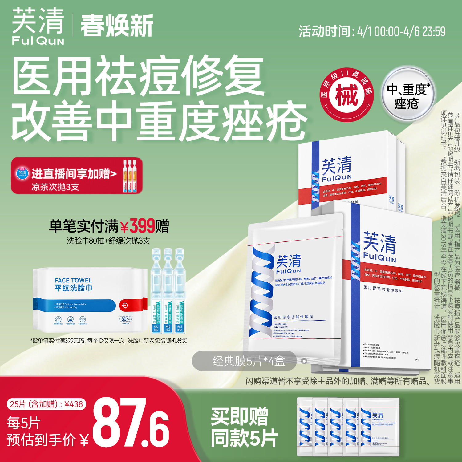 芙清经典膜医用祛痘凉茶色敷料术后修复痤疮械字号非面膜