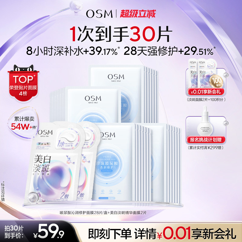 欧诗漫玻尿酸沁润修护面膜补水保湿提亮水润冷敷贴8小时深补水