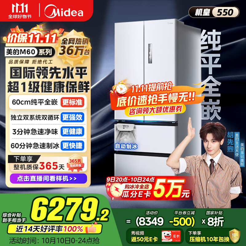 美的(Midea)M60机皇550法式多门超薄纯平全嵌一级除菌净味大容量家用制冰冰箱双系统MR-550WUFIPZE国家补贴