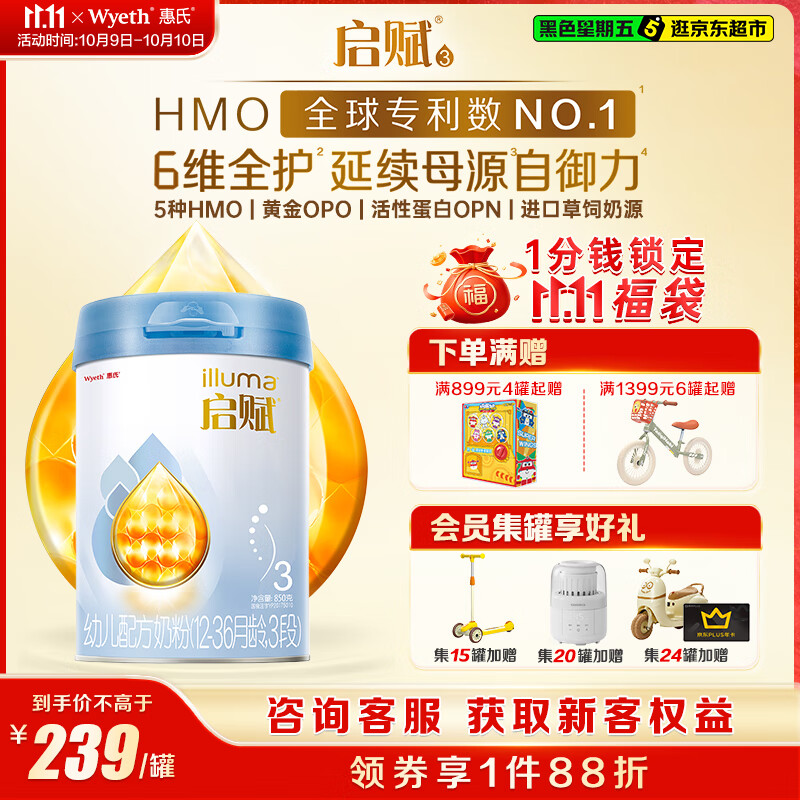 惠氏(Wyeth)启赋蓝钻【加量装】HMO幼儿配方奶粉3段(12-36月)850g